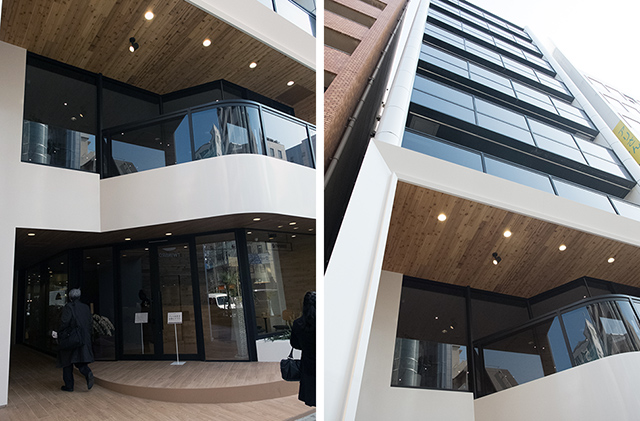 右)2Fまではウッドを配し、柔らかいデザイン。上、9Fまでビルが続く