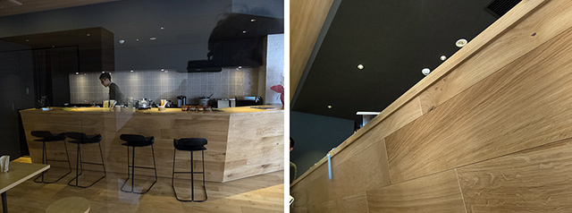 左)ゲートカフェを外から撮影、右)木のカウンター