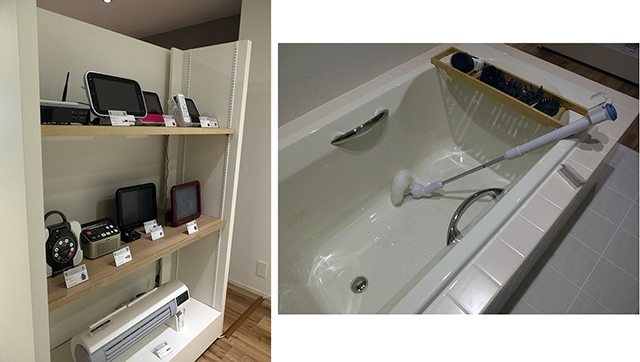左)棚陳列。高い評価を得ている人気商品、お風呂TV他、AV関連、右)お風呂スペース