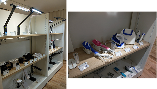 左)棚陳列。LEDスタンド。最近の傑作モデル、右)棚陳列。使い勝手のイイ、スチーマー