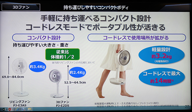 左、中)3Dファン:PJ-E2DS(スタンダード)、右)3Dファン:PJ-E2DBG(コードレス)