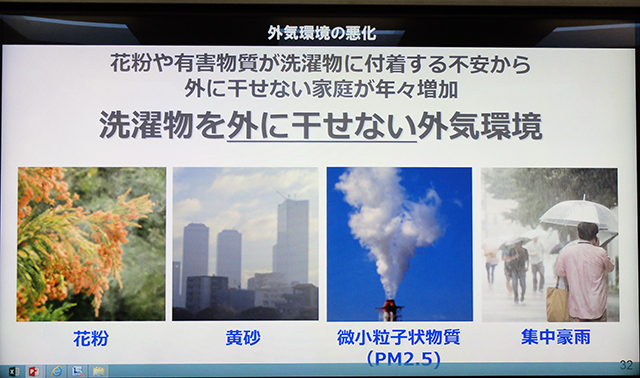 花粉症の人は、今時分、外に洗濯物を干したくないでしょうし、外気の汚染状況を考慮すると外に洗濯物を干すことは、どんどんなくなりそうです。