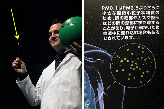 左)黃矢印が、最近話題になりつつあるPM0.1。緑玉のPM2.5に比してすごく小さい。