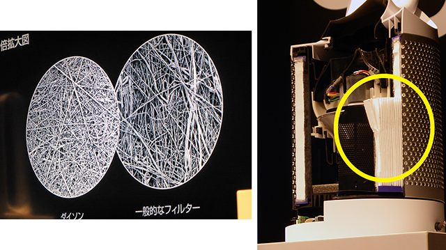 左)フィルターの粗さ比較。ダイソンのフィルターと一般的なフィルター。