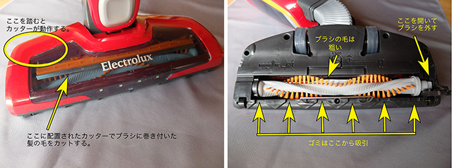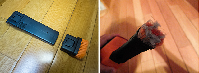 右)ブラシはホコリが多い所では、ホコリが巻き付いてしまう。