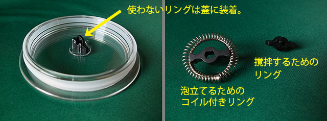 泡立て用のリングは、「気泡が入りやすくなっている形状」のものと、「撹拌だけの形状」のものの2つです。
