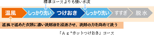 洗濯前に温風を吹きかけて衣類を温めてから、濃縮洗浄とつけおき洗いで皮脂汚れをしっかり落す「Ag+ホットつけおき」コースが採用されています。