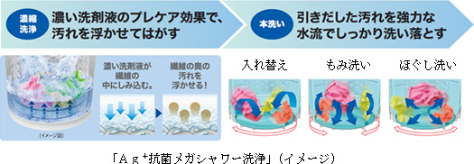 高濃度の洗剤液を素早く衣類に浸透させて、しつこい脂汚れなどを浮かび上がらせる濃縮洗浄と、衣類に2方向から注ぐ「Ag+抗菌メガシャワー」の力強い押し洗い効果で、衣類をしっかり洗います。