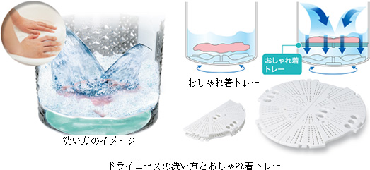 「ドライ」または「手洗い」マークの衣類などがご家庭で洗える「ドライ」コース用に、パルセーターが直接衣類に触れずに洗える当社独自の「おしゃれ着トレー」を採用。