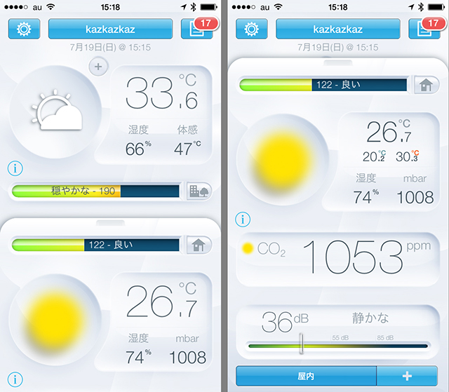 左)スマホ用アプリのTOP頁。上側が外、下側が室内、右)室内の詳細データー頁。