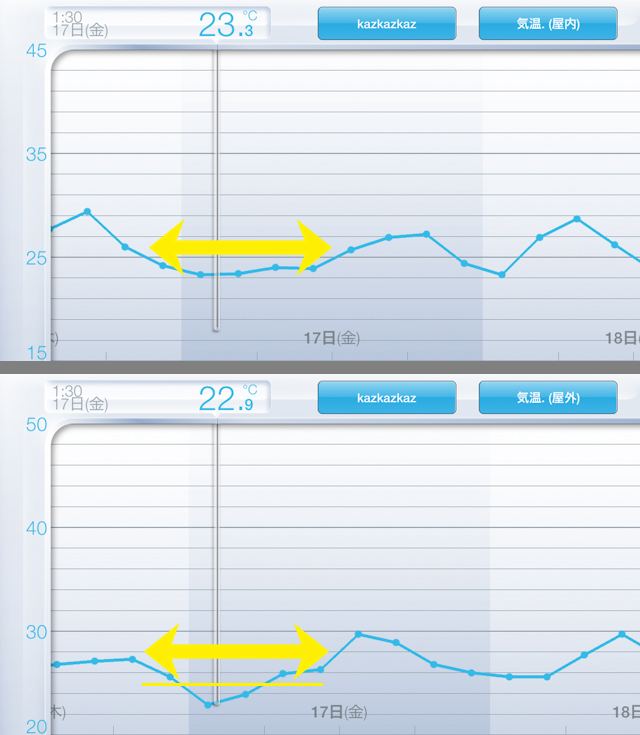 外気が25℃近辺から以下になると、室温もそれにつれて下がっていることが確認できる。