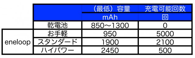 上の表が現在販売されているeneloopの数値である。お手軽品はアルカリ電池同等、その他2つの容量はアルカリ電池を凌駕するレベル。
