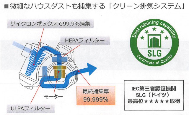 サイクロンシステムで、0.3μm以上のゴミ:99.9%の捕獲ができますが、あと2つのフィルターを装着することにより、99.999%の最終捕集率を持ちます。