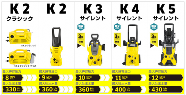 今まで13機種あった家庭用高圧洗浄機ラインナップを、6機種に絞り、入門モデルの「K 2」クラスから最上位の「K 5」の4クラスに、最大許容圧力別に分類。