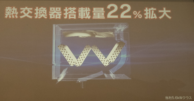 ファンから送り出される風を受ける場所に、横から見ると「W」字型に積層させ、通常のエアコンより熱交換器の搭載量をアップしています。