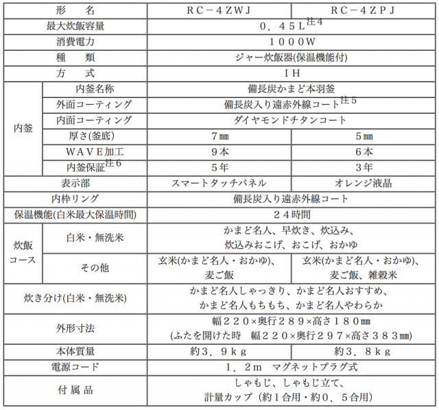 東芝から、IHジャー炊飯器の新製品、「備長炭かまど本羽釜」の小容量タイプ(2.5合炊き)「RC-4ZWJ」が、2016年1月上旬から、「RC-4ZPJ」が2015年11月中旬から、いずれもオープン価格にて、発売されます。