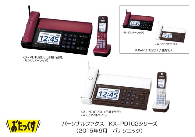 パナソニック(株)から、自宅の固定電話への着信を外出先のスマートフォンや携帯電話に転送できるパーソナルファクス KX-PD102シリーズが、オープン価格にて、10月15日に発売されます。