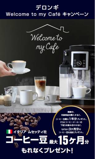 デロンギ・ジャパン(株)が、2015年10月9日(金)~2016年1月31日(日)までの対象期間、デロンギの全自動エスプレッソマシン7機種のいずれかの購入者に、もれなく、イタリアの老舗ロースター・ムセッティ社のコーヒー豆をプレゼントする「Welcome to my cafeキャンペーン」を実施します。