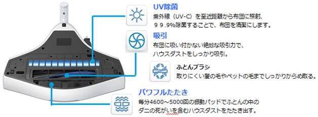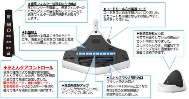 ●ふとんの種類と素材に合わせてふとんブラシ、たたき、吸引力を最適化した新機能「ふとんケアコントロール」 搭載●圧力センサーを搭載し、吸引したハウスダストの量を感知してアラームで標準フィルターの洗浄時期を告知する「標準フィルター洗浄お知らせ機能」を採用。