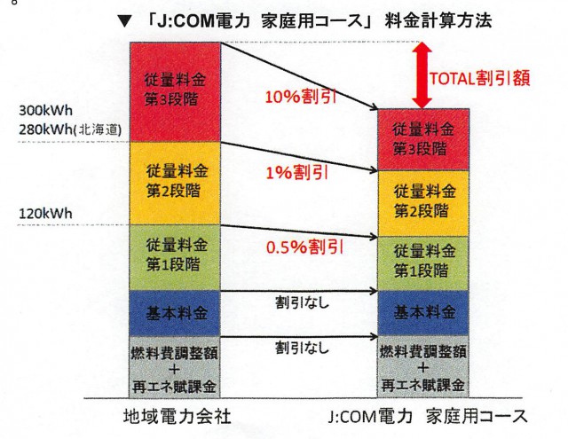 で、J:COMは、120kWhまでを従来価格:0.5%割引、300kWh(北海道のみ280kWh)を1%割引、それ以上を10%割引にするとのことです。