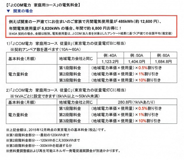 こちらの方は、J:COMのサービスとのセットで電気料金が最大で8%お得にプランだそうです。そして低圧(一般家庭用)にも2016年4月から参入。その料金プランが本日発表されました。