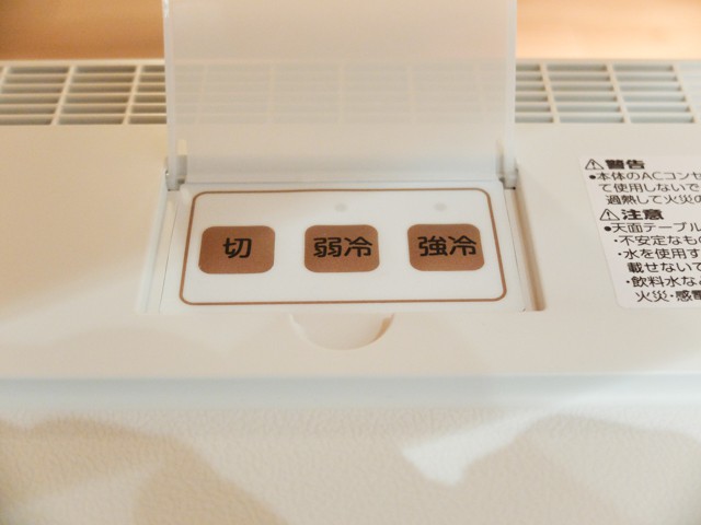 スイッチのオン、オフ、弱冷蔵(15℃)、強冷蔵(5℃)は天面スィッチで操作。