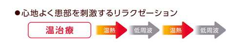 「温治療コース」は、患部を約41℃の温度で約30秒温めた後に、低周波(微弱な電気)による刺激で約60秒間痛みやコリを心地よくほぐします。