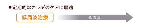 温めることで血行を良くし、コリの解消や筋肉の疲労回復を早める効果が期待できます。「低周波コース」は、30分間、低周波でじっくり治療し、定期的な体のケアにおすすめです。