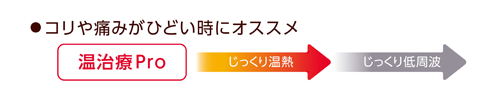 「温治療Proコース」は、15分間じっくり温めてから15分間低周波でしっかりと治療します。強いコリ、痛みには1200Hzの高い周波数の「深部モード」で、痛みを伴う部位を治療します。コリ、痛み、冷えなどの悩みが深刻な方におすすめです。