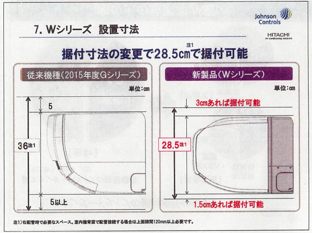 更に、設置の際に必要な予備スペースは、Gシリーズの場合、上側:5cm、下側:5cm以上必要だったのが、新型のWシリーズでは、上側:3cm、下側:1.5cm!