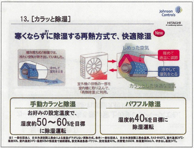 日立の除湿は、これに対し室外機で出す熱の一部を使い空気を暖めます。
