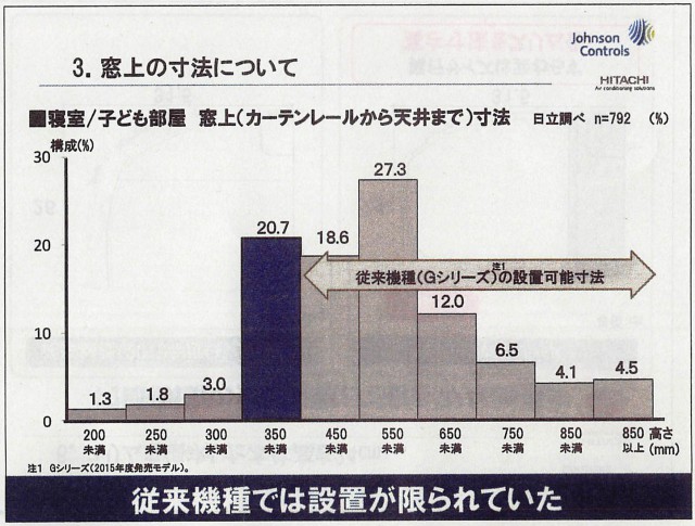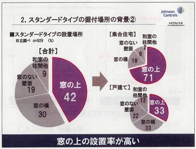 日立の資料によると、スタンダード型の設置は、窓の上:42%、窓の横:30%、窓のない壁面:19%、和室の柱間他:9% だそうです。