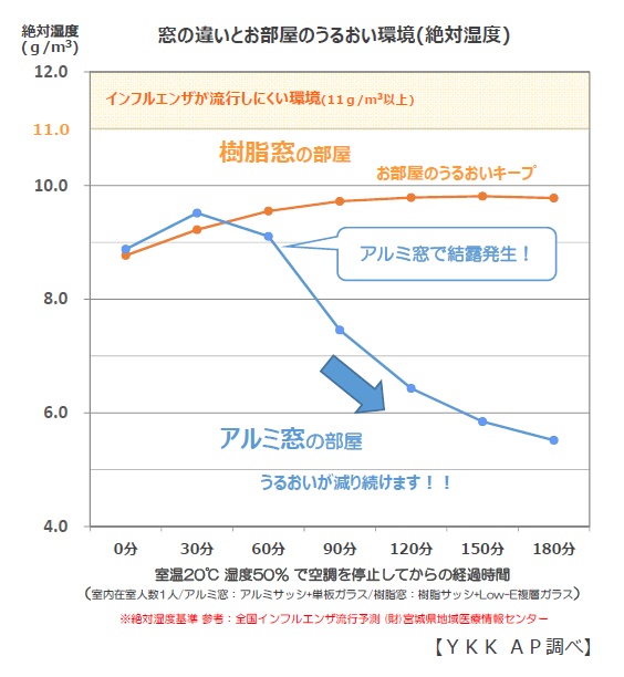 その結果、試験環境下では、測定開始後まもなく「アルミ窓」には結露が発生し、時間の経過とともに部屋の絶対湿度が下がり続けるのに対し、「樹脂窓」には結露が発生せず、部屋の絶対湿度も、インフルエンザ予防の目安とされる11g/㎥に近い値が一定に保たれる ことが分かりました。