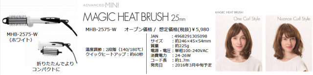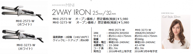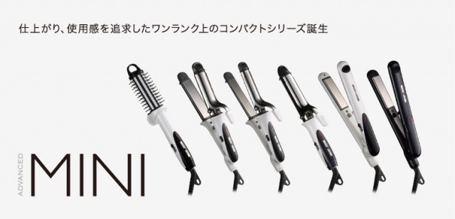 「ADVANCED MINI(アドバンスミニ)」として発売されるのは、ストレートアイロン(2色展開:ホワイト/ブラック)、カーリングアイロン、2WAYアイロン(2機種:25mm,32mm)、マジックヒートブラシの全4機種を取り揃えた計6製品。
