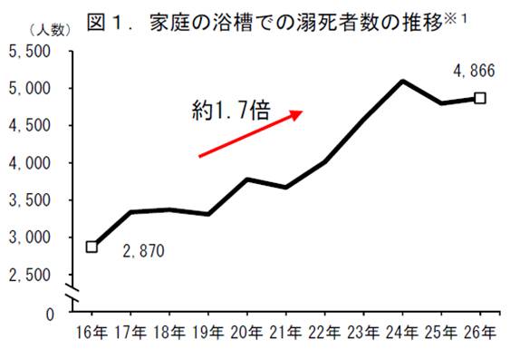 厚生労働省の研究班調査では、救急車で運ばれた患者から推計した2015年度の入浴中の事故死の数は、年間19,000人とされています。また、厚生労働省の人口動態統計による家庭の浴槽での溺死者数は、平成26年に4,866人で、平成16年と比較し10年間で約1.7倍に増加していると発表されました。(2016年1月20日 消費者庁 発表内容要約)