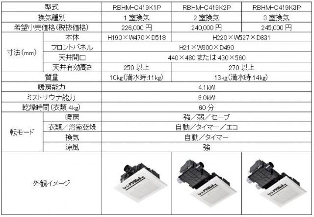 総合熱エネルギー機器メーカーのリンナイ(株)は、標準モジュールタイプ(暖房能力4.1kW)の天井埋め込み型浴室暖房乾燥機を4月1日から発売します。