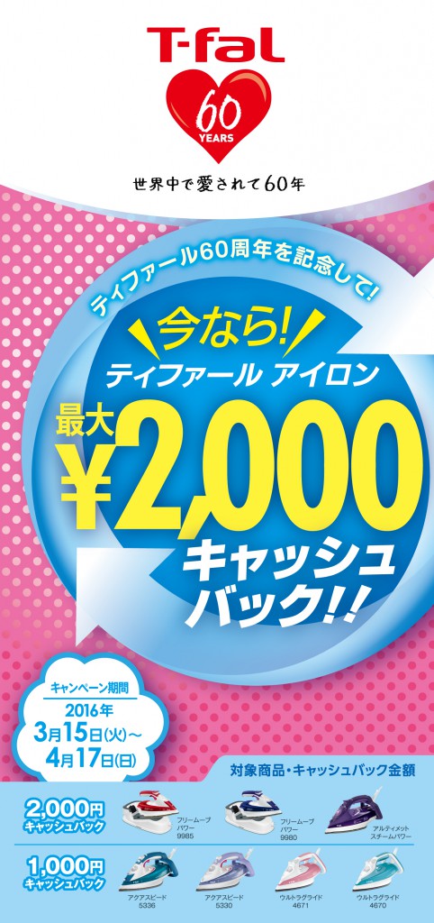 (株)グループセブ ジャパンは、ティファール誕生60周年を記念して、ティファール アイロンご購入の方に最大2,000円をキャッシュバックするキャンペーンを実施中です。