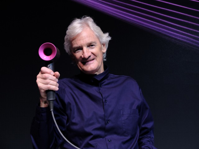 ジェームズ・ダイソン氏。手に持っているのが新製品のDyson Supersonic ドライヤー。