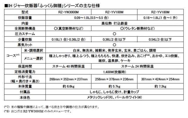 このほか、少量でもおいしく炊ける加熱制御を行う「1合まで」「2合まで」の少量炊飯や、炊飯時に蒸気をほとんど排出しないため、置き場所に困らずキッチンも快適な「蒸気カット」新製品RZ-YW3000Mのみ。炊き方「白米・極上ふつう」コース、0.54L(3合)炊飯時、標準水量0.6L(600mL)に対して排出蒸気量約6.6mL(約1.1%)。メニューや周囲環境などによって、排出蒸気量は異なります。日立調べ。を搭載しています。