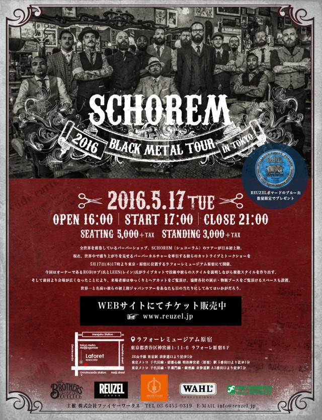 世界で最も影響力があり、最も有名なバーバーとも言われる、オランダ・ロッテルダムのSCHOREM(シュコーラム)が日本初のツアーイベント、”2016 BLACK METAL TOUR in TOKYO”を2016年5月17日(火)にラフォーレ・ミュージアム・原宿(東京)で開催。そのイベントを記念して、SCHOREMとWAHLが初コラボします。