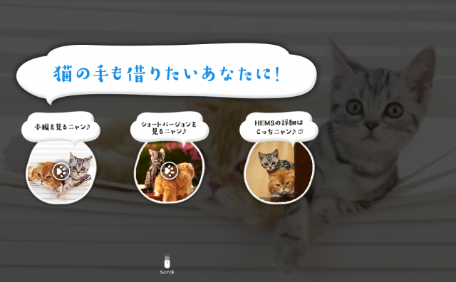 「HEMSニャン」サイトでは、「猫の手も借りたいあなたに!」をキャッチフレーズに、2匹の猫「HEMSニャン」が、 「スマートHEMS」の便利な機能や、「サービスアプリ」の活用法を分かりやすく解説しています。