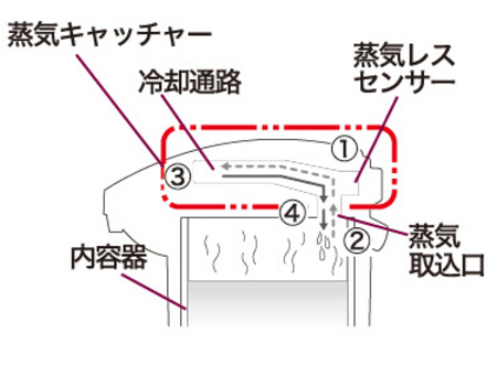 2)沸とう時に出た蒸気は、蒸気取込口からふた内部の蒸気キャッチャーに入ります。