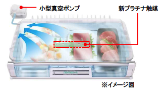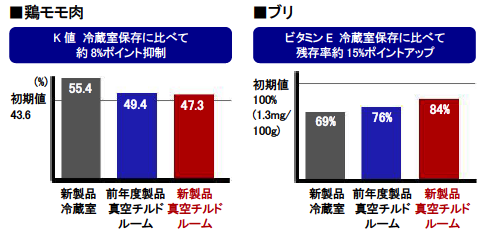真空構造「真空チルドルーム」内は約0.8気圧で大気圧よりも低いので、日立アプライアンスでは真空と呼んでいます。で低酸素状態により酸化を抑え、肉・魚が凍らない約−1℃約−1℃は「真空氷温」モード設定時。この他、豆腐など水分の多い食品が凍らない約1℃のモードが選択可能。の「真空チルド」は、能力を向上させた新プラチナ触媒日立アプライアンス調べ。(以下同じ)日立従来モデル:R-X6700F(2015年度モデル)「真空チルドルーム」に比べ炭酸ガス生成量約1.5倍。「真空チルドルーム」に肉90g、魚600gを入れドア開閉なしで3日間保存。により、食品表面の酵素の働きを抑えておいしく保存します3日間保存後のK値、栄養素の残存率で見ています。冷蔵室保存との比較。。