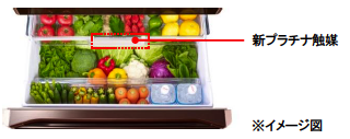 水分を閉じ込めて乾燥を抑える「新鮮スリープ野菜室」にも新プラチナ触媒日立従来モデル:R-X6700F(2015年度モデル)「新鮮スリープ野菜室」に比べ炭酸ガス生成量約1.2倍。「新鮮スリープ野菜室」に上段:約1.2kg、下段:約1.9kg、たて収納:約1.3kgの野菜をラップなし、ドア開閉なしで7日間保存。を採用し、炭酸ガスの効果で野菜を眠らせるように保存炭酸ガスの効果により、野菜の呼吸を抑制して鮮度低下を遅らせることを表しています。して、みずみずしさと栄養素を長持ちさせます7日間保存後の水分と栄養素の残存率の比較。日立従来モデル:R-G6700D(2013年度モデル)「うるおい野菜室」との比較。。