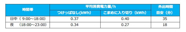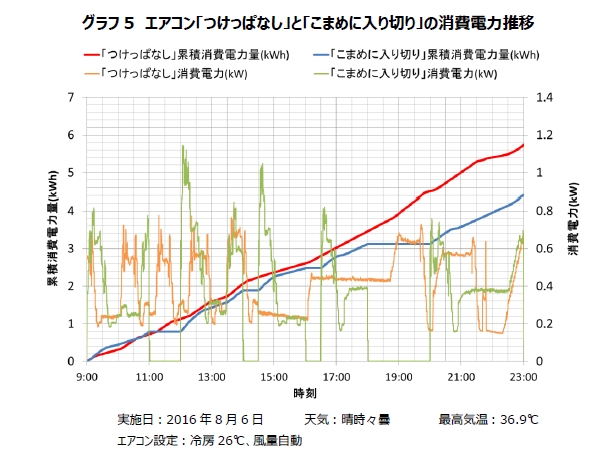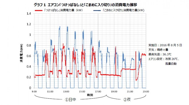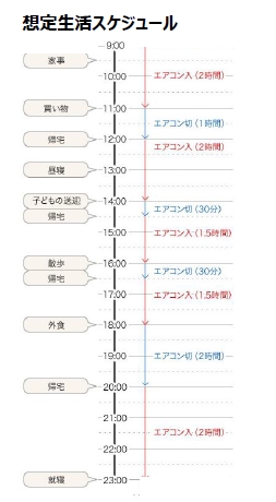 1日の生活スケジュールを想定して、9:00から23:00まで「つけっぱなし」にしたエアコンと、外出時に運転をOFFにしたエアコンの消費電力量を比較調査。