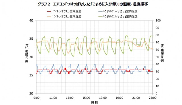 今回の実験条件では、日中の気温が高い時間帯の30分程度の外出であれば、「つけっぱなし」の方が安いという結果となりました。また、エアコンを「つけっぱなし」にした部屋と「こまめに入り切り」した部屋の温度と湿度を比較したところ、「こまめに入り切り」した部屋の運転をOFFにした後の温度、湿度はともに高く、快適性に大きな差があることもわかりました。熱中症が気になるこの季節、今回の実験結果を参考に、電気代や快適性を考慮して日中の短時間の外出であればエアコンを「つけっぱなし」にしてみるなど、「つけっぱなし」と「こまめに入り切り」を上手に使い分けましょう。