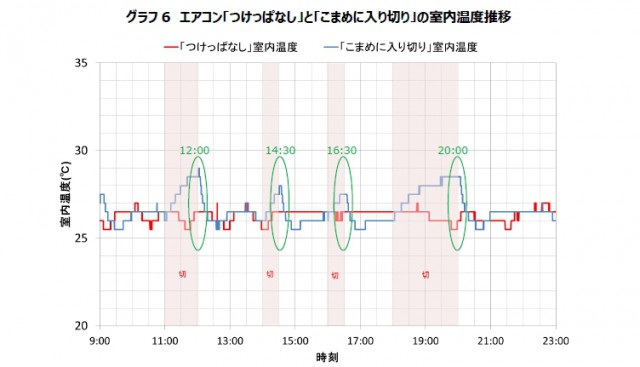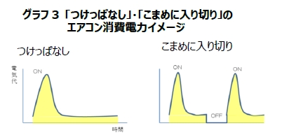 9:00から23:00まで「つけっぱなし」にしたエアコンと、30分間隔でON/OFFを繰り返したエアコンの消費電力量を比較し、「つけっぱなし」の方が安くなる時間帯を調査。
