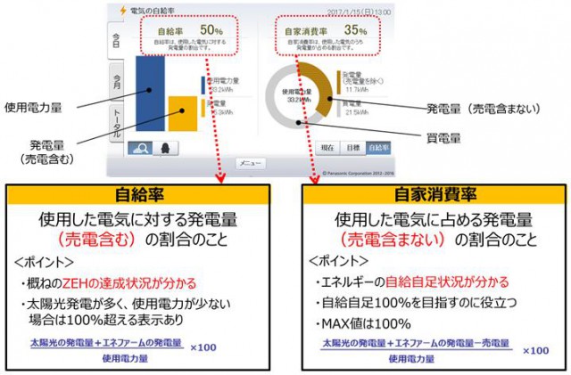 ■ZEH対応:エネルギーの自給自足状況が分かる 太陽光発電システムやエネファームで発電した電気を、 自宅でどの程度使用したのかがひと目で分かる