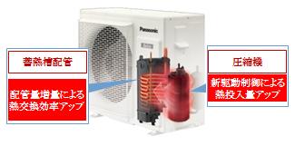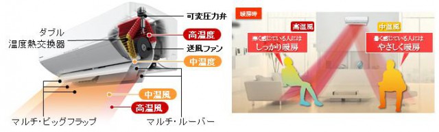 本製品は、新開発の可変圧力弁により世界で初めて異なる2つの温度を作る「ダブル温度熱交換器」(暖房時最大約10℃差パナソニック社測定基準による。CS-WX407C2、パナソニック社環境試験室(14畳)、外気温2℃、暖房運転、設定温度25℃、「センサー」設定時。室温安定時、エアコン熱交換器の可変圧力弁上流側(2相域)と下流側(2相域)の温度差を比較。)と、新開発の「マルチ・ビッグフラップ」「マルチ・ルーバー」を搭載した「ダブル温度気流」システムで、温度の異なる2つの温風を同時に吹き出すことが可能になったとのことです。