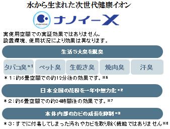 「ナノイー」は空気中の水に高電圧を加えて生成されるナノサイズの微粒子イオンです。本モデルは、ナノイーデバイスの放電部を改良し、花粉などの抑制効果を発揮するOHラジカルを10倍生成する「ナノイー」:毎秒4,800億個と、「ナノイーX」:毎秒4兆8,000億個との比較。 ESR法による測定。(パナソニック社調べ)新デバイス「ナノイーX」を搭載しました。従来の除菌効果に加えて、生活5大臭の脱臭に対応し、特にタバコのニオイは10倍(当社調べ)の脱臭スピード「ナノイー」:120分で臭気強度1.2低減と、「ナノイーX」:12分で臭気強度2.4低減、との比較。を実現。また、花粉は日本全国の花粉を無力化します。さらに、内部クリーン機能と合わせて、エアコン室内機内部のカビの成長を抑制【試験機関】環境生物学研究所【試験方法】環境試験室(約6畳)での試験。エアコン内部にカビセンサーを設置。室温25℃、湿度70%で、内部加熱・乾燥有無の条件で、冷房運転を1日2時間、4日間実施し、カビセンサーの菌糸長を比較【抑制の方法】エアコン内部の加熱と乾燥【対象】エアコン内部に付着したカビ【試験結果】カビ菌糸の成長抑制効果あり。No.141104し、吹き出す風をキレイにすることで快適な空気環境を実現したそうです。